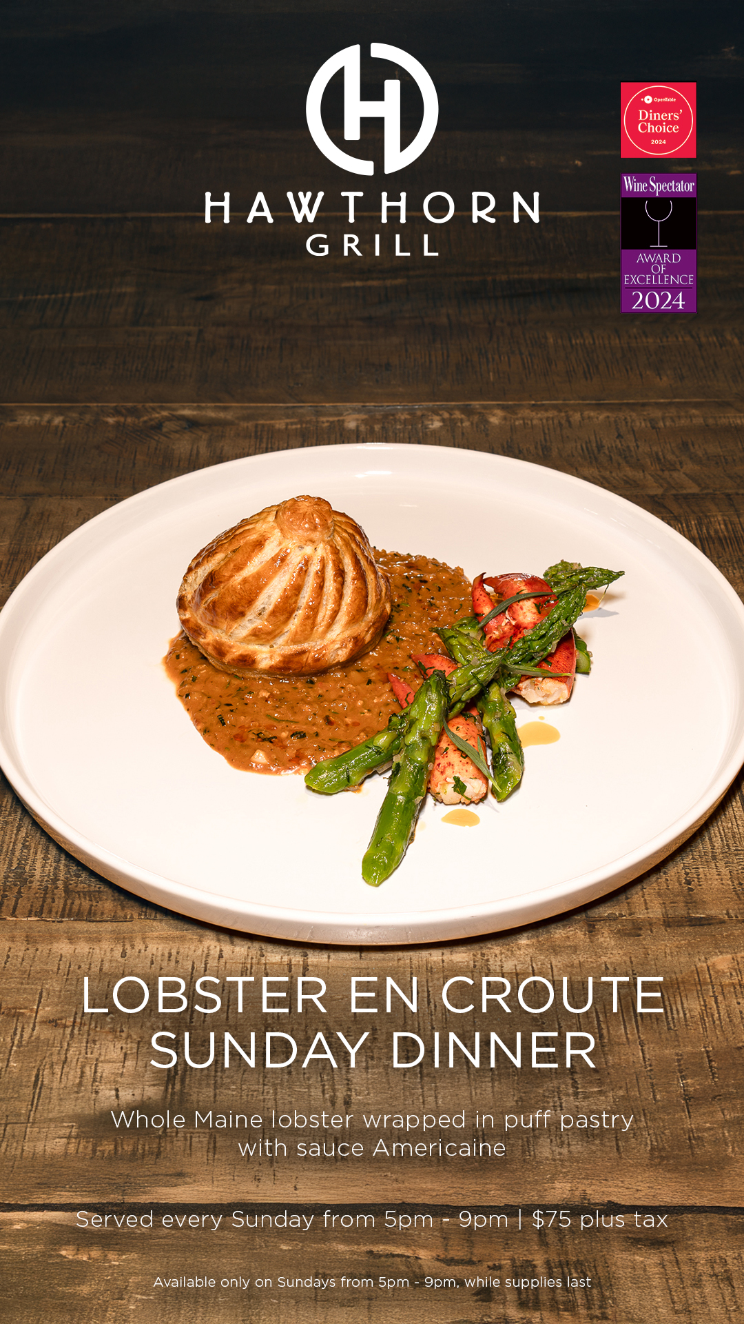 Enjoy our Lobster en Croute Sunday Dinner at Hawthorn Grill Steakhouse in Summerlin Las Vegas for $75, plus tax.